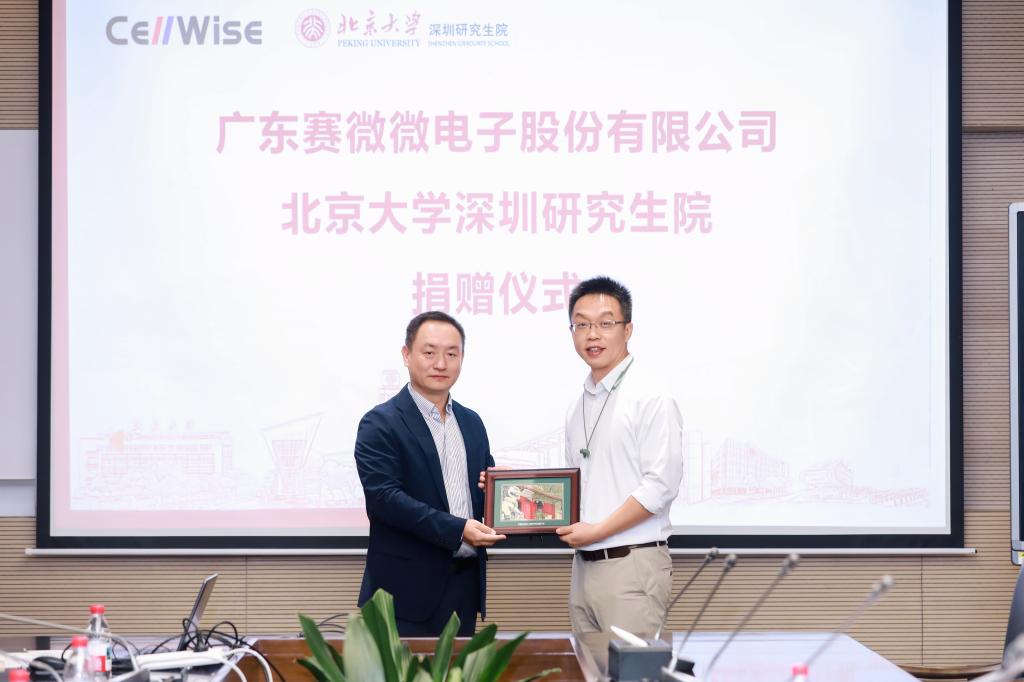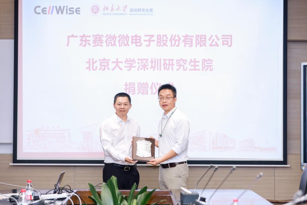 随后,双方签署捐赠协议。王天兵为赛微微电颁发荣誉奖牌,牛宏伟为赛微微电赠送纪念品。