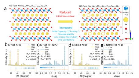 钠离子电池因资源丰富及成本优势,被视为极具潜力的替代储能方案。其中,O3型层状氧化物正极材料具有较高的理论容量,备受学术界与产业界瞩目。然而,在实现高容量的高压深度脱嵌钠过程中,该类材料面临严重且不可逆的阴离子氧化还原反应及复杂的多步相变。上述不可逆过程可导致晶格畸变、阳离子不可逆迁移及界面阻抗急剧增大,最终造成材料的放电容量与工作电压在循环中快速衰减,严重制约了高比能O3型层状正极的实际应用。